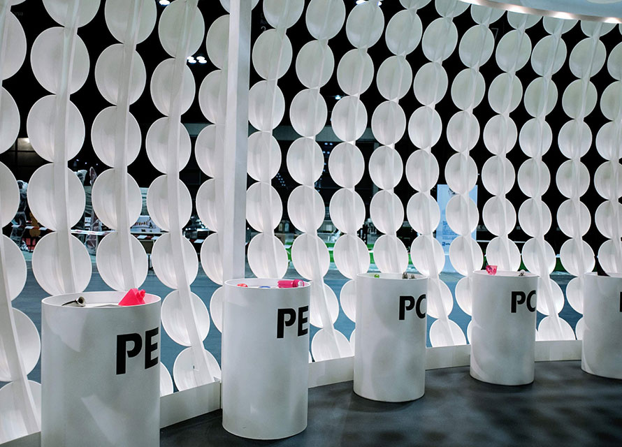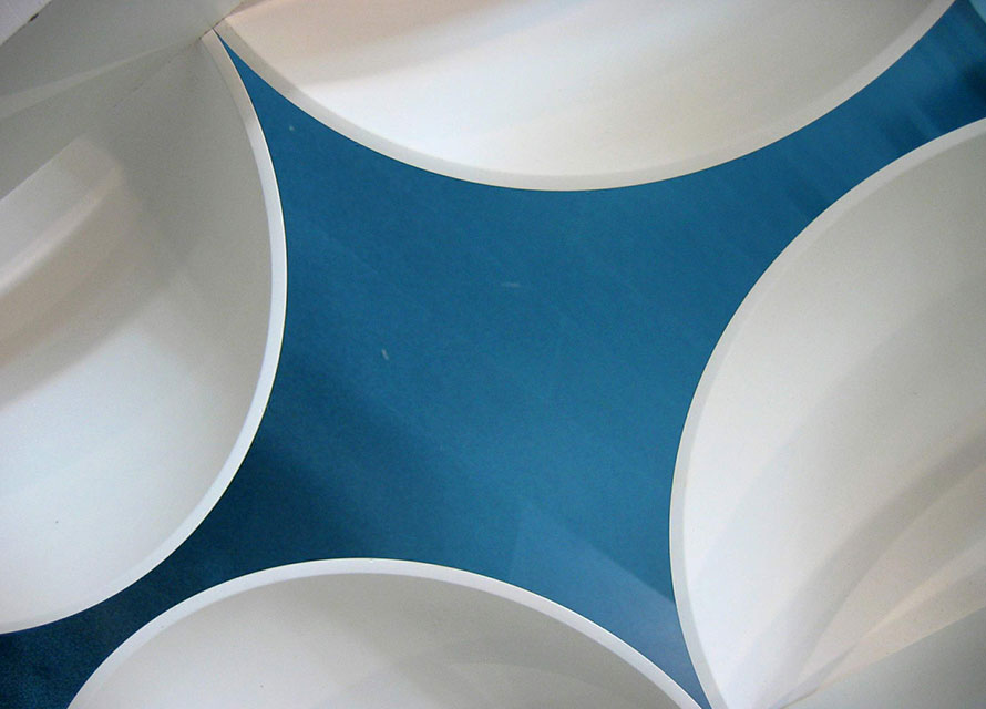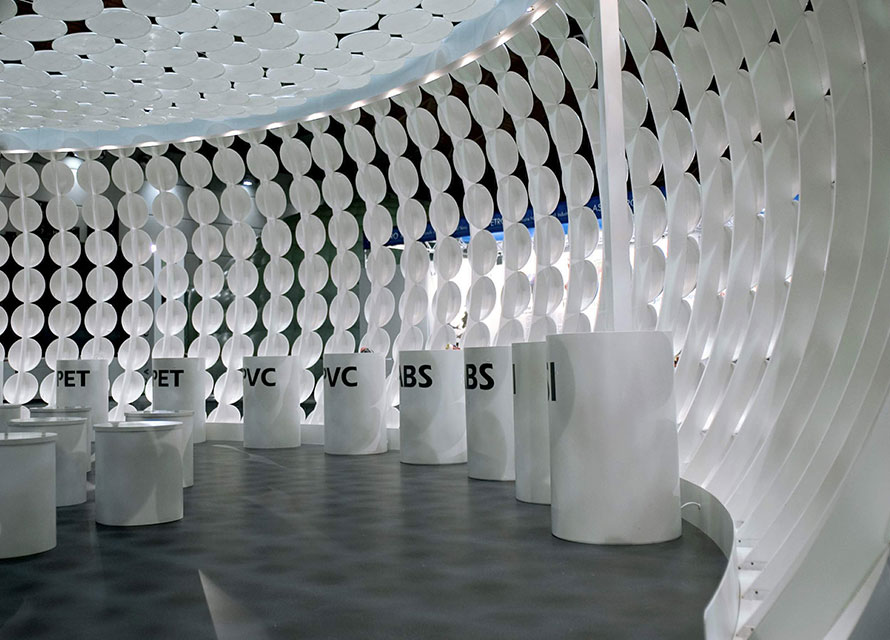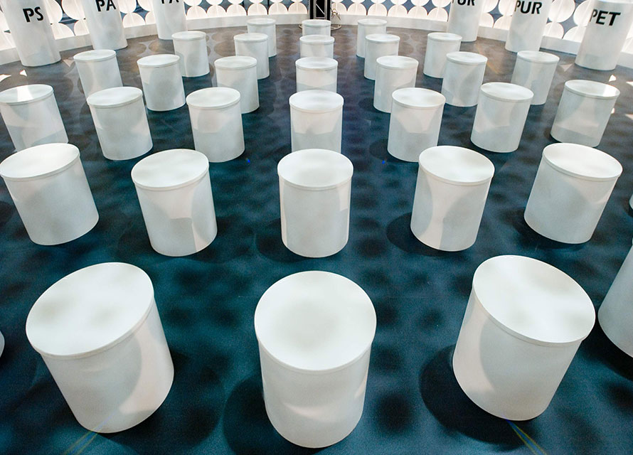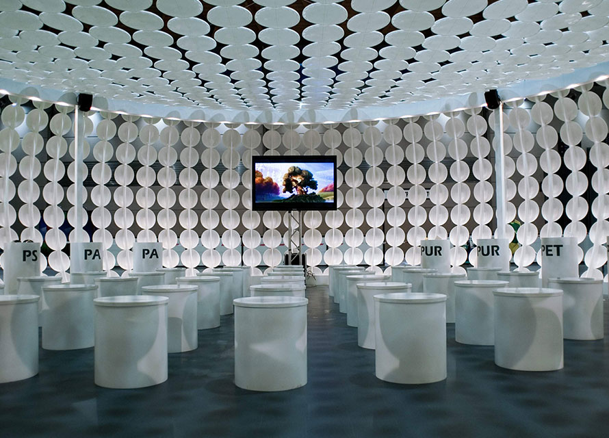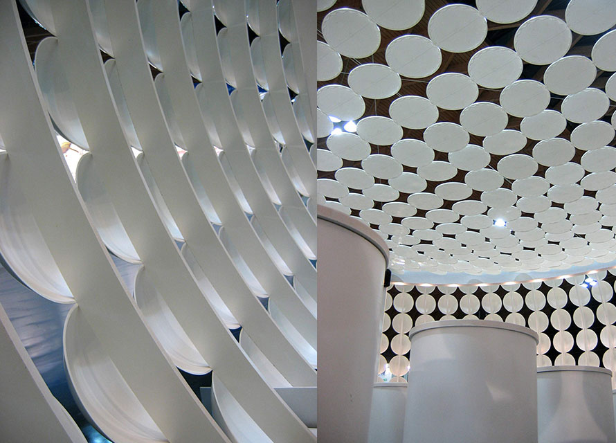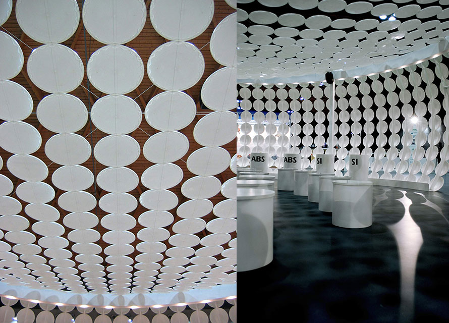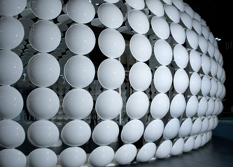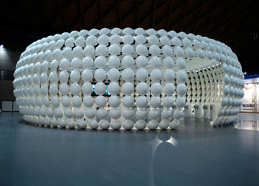 L’esterno è avvolto in una pelle composta da centinaia di dischi di plastica bianca, creando una fitta struttura molecolare.