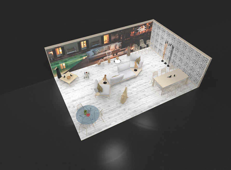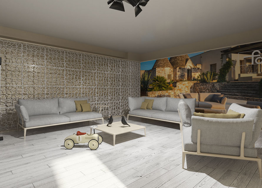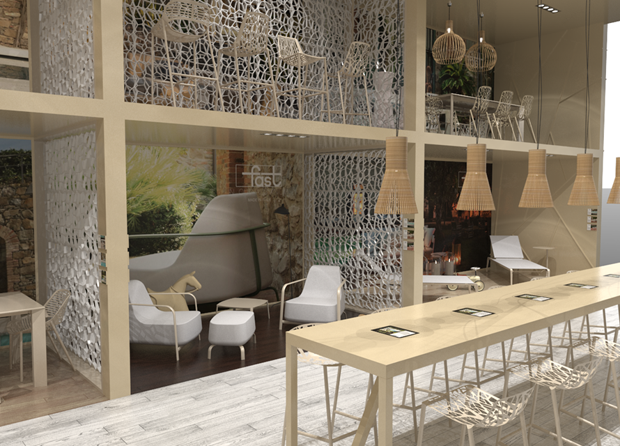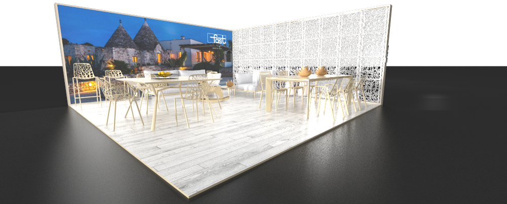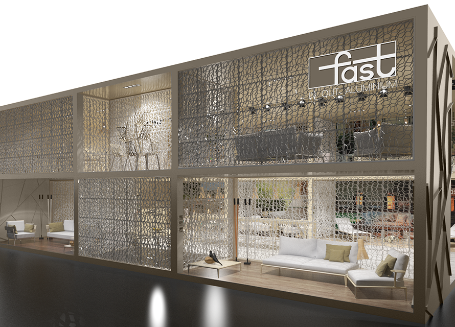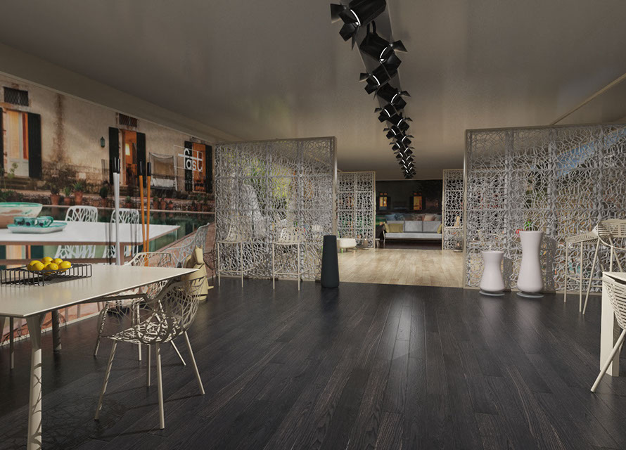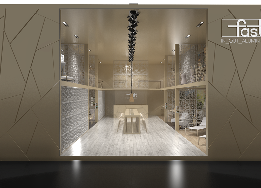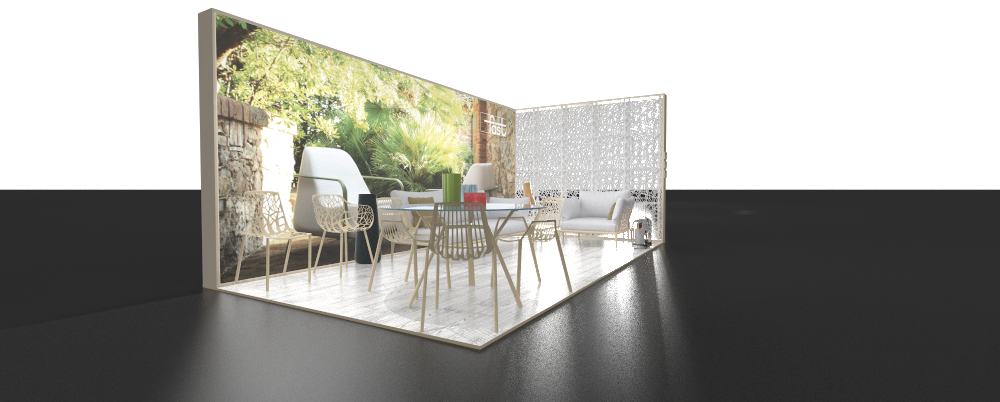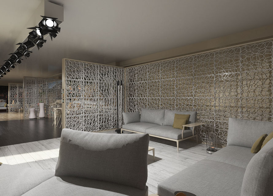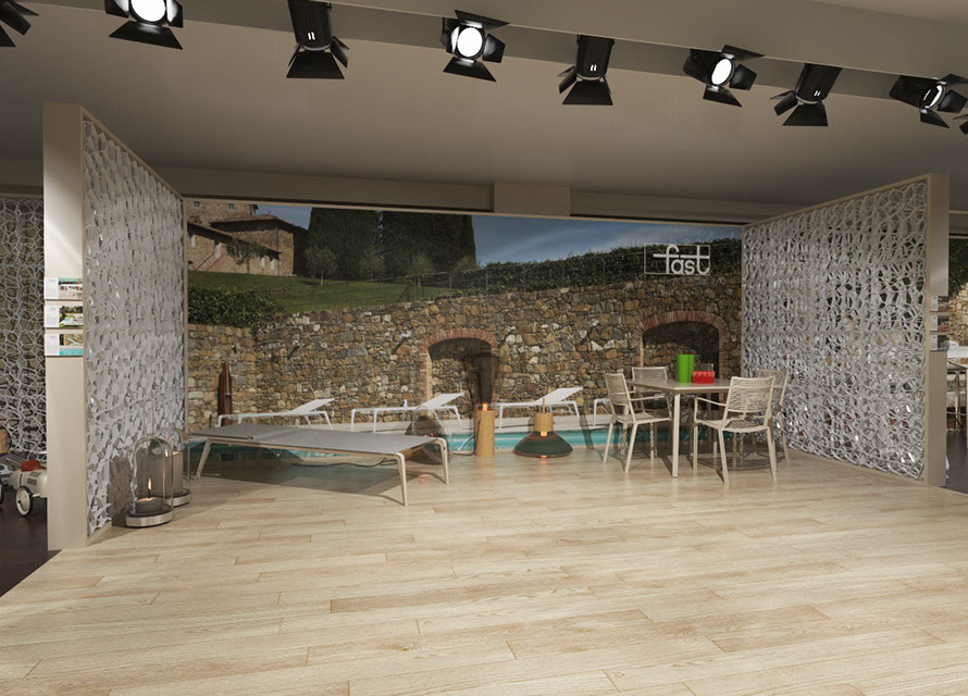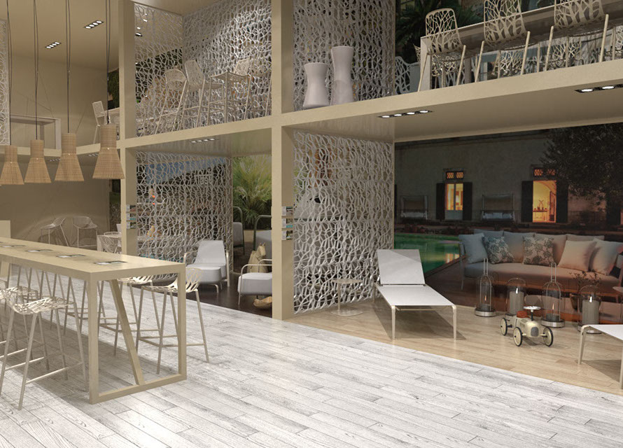 Area espositive progettate per essere inserite in Showroom multimarca. Lo spazio prevede una parete con immagine retro illuminata e una o più parete divisorie realizzate con una piastrella (salvaprato) tridimensionale in PVC.