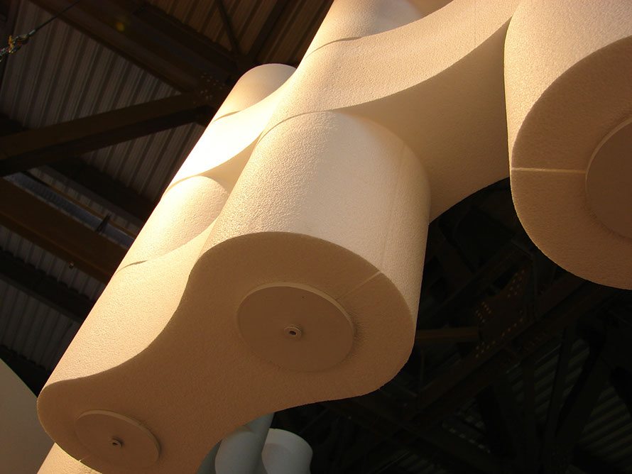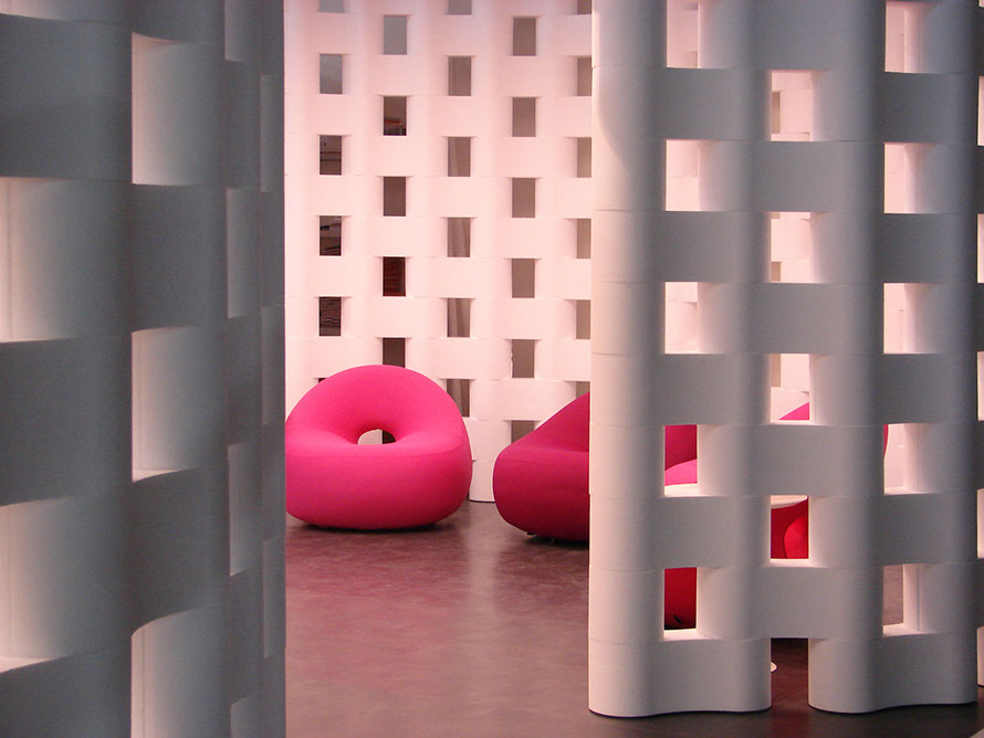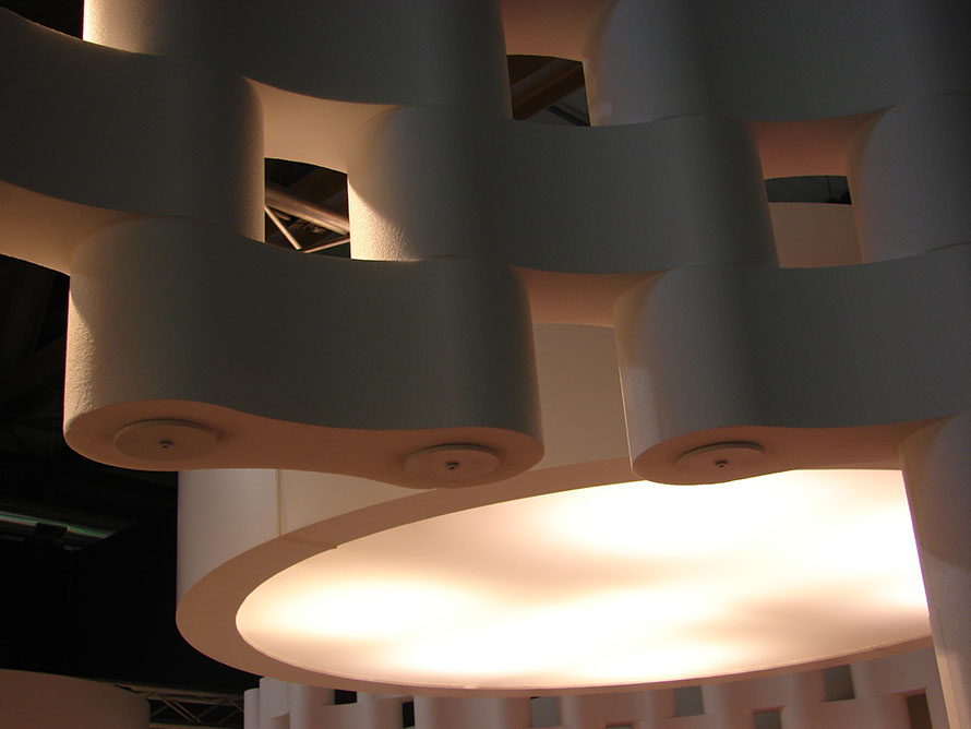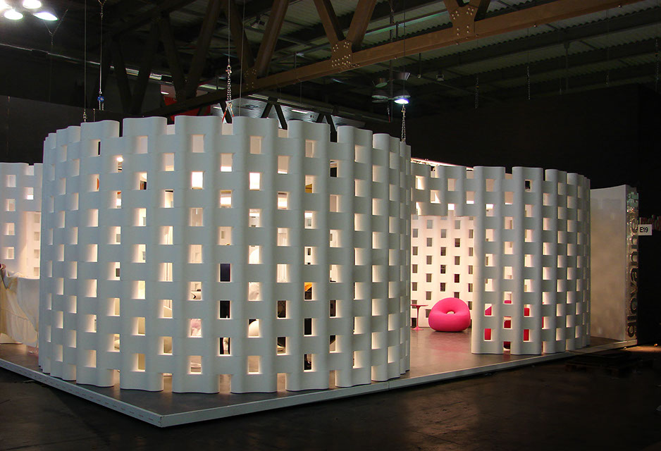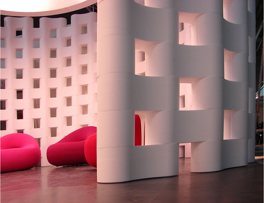 L’intero perimetro dello stand è realizzato con due semplici elementi in polistirolo bianco tagliato a filo.
