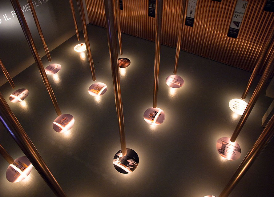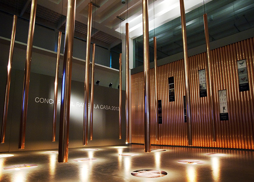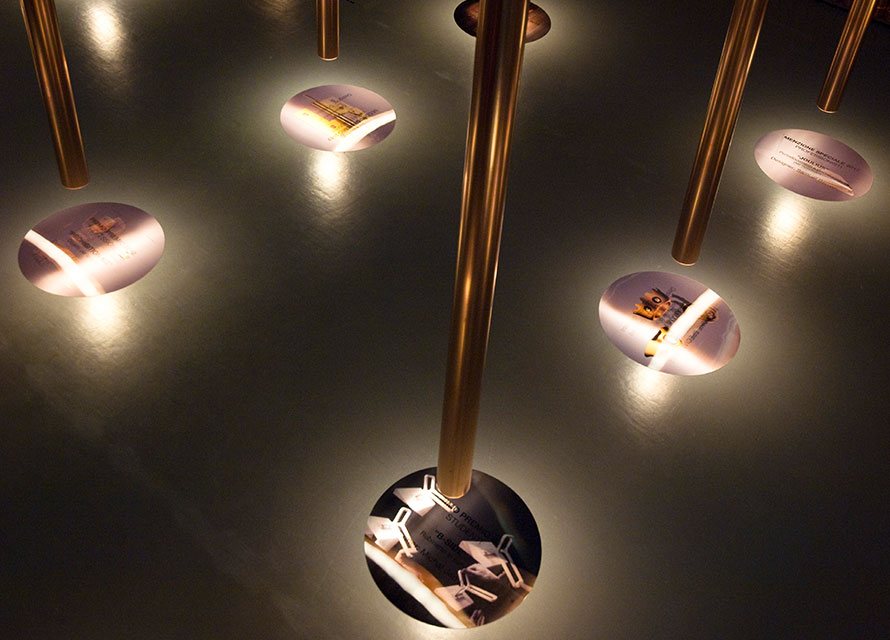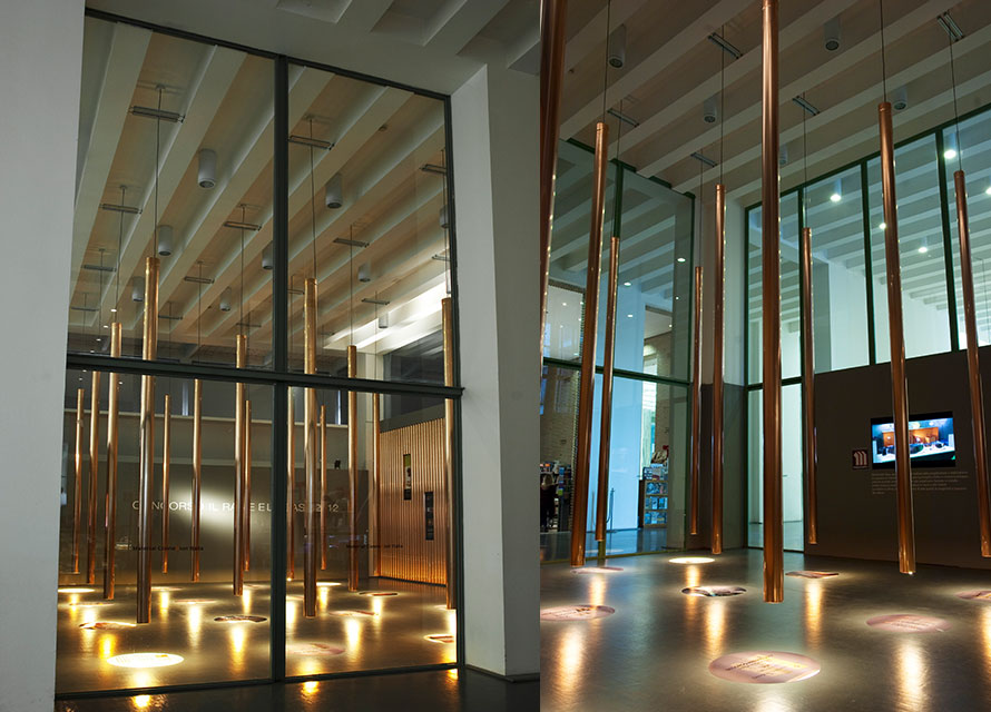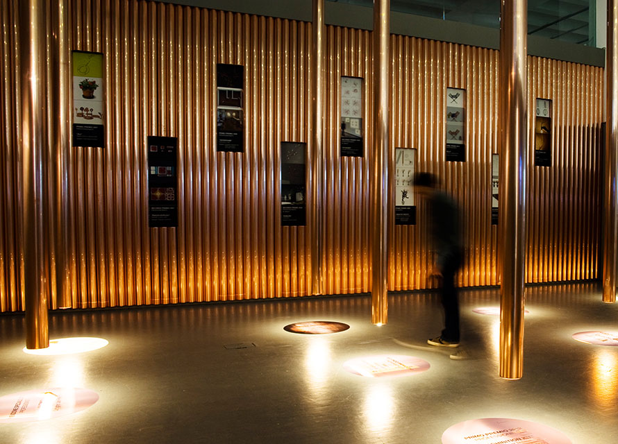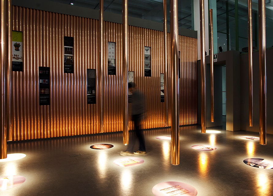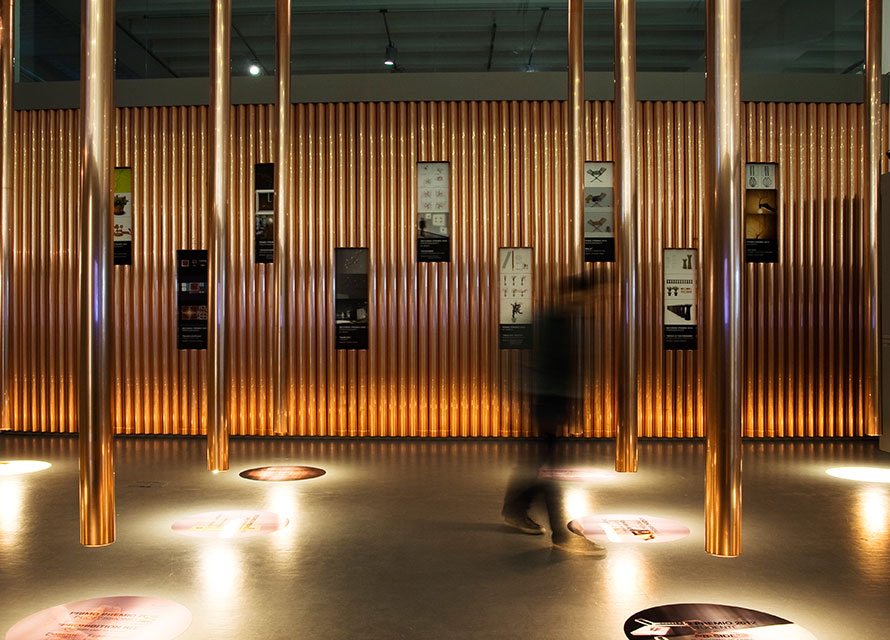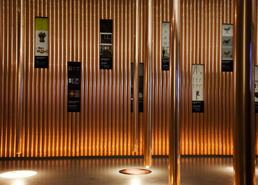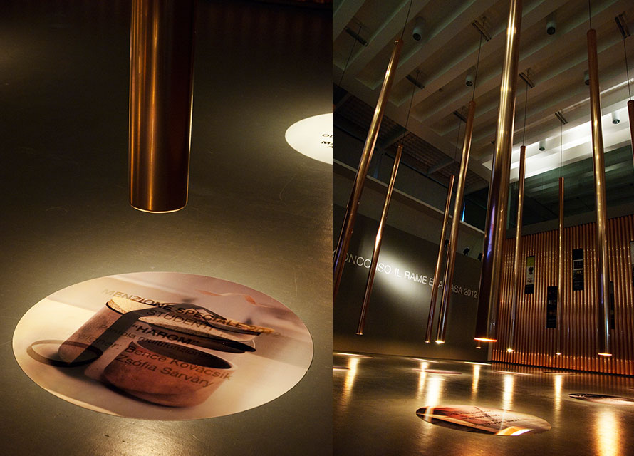 In occasione della premiazione del concorso biennale di progettazione con il rame, è stata realizzata una installazione allo spazio di Material ConneXion con pluviali che illuminano dall’alto le tavole posizionate a terra, mentre altri pluviali decorano la parete di fondo dello spazio,