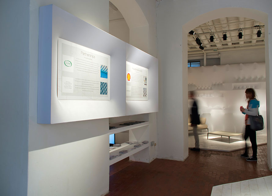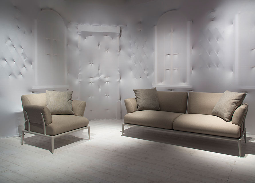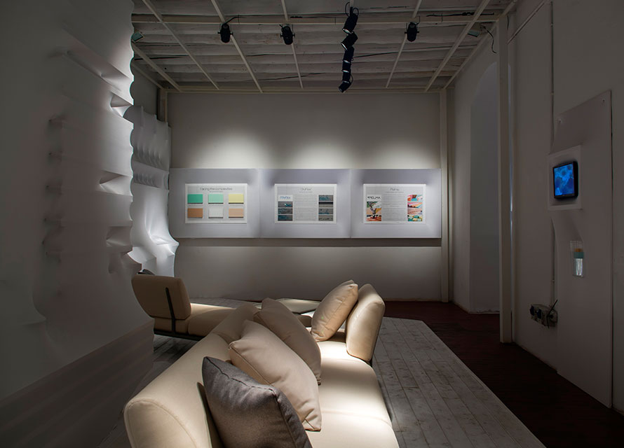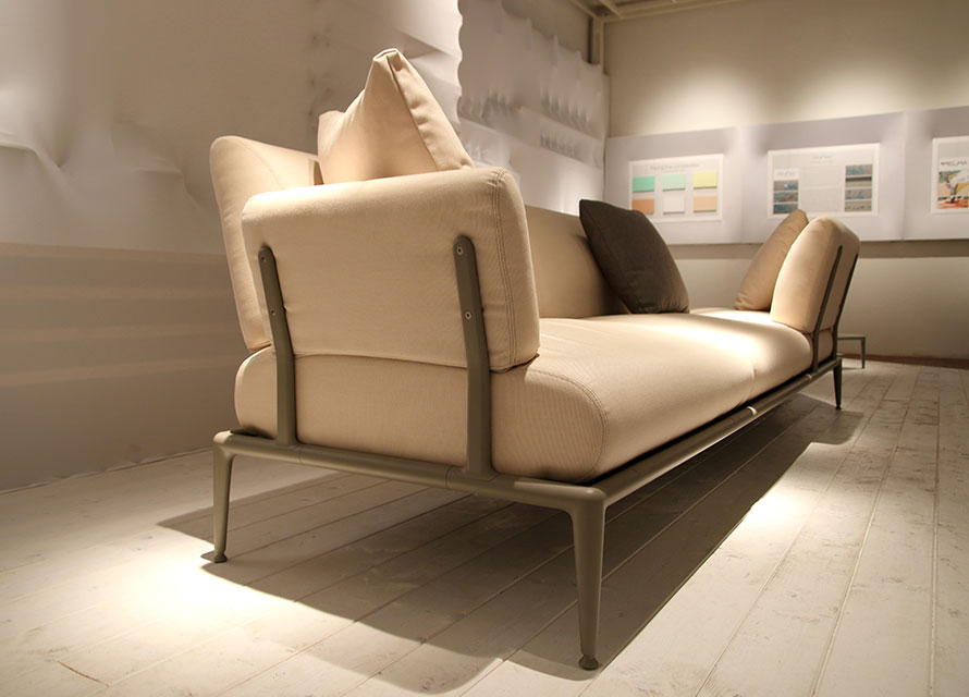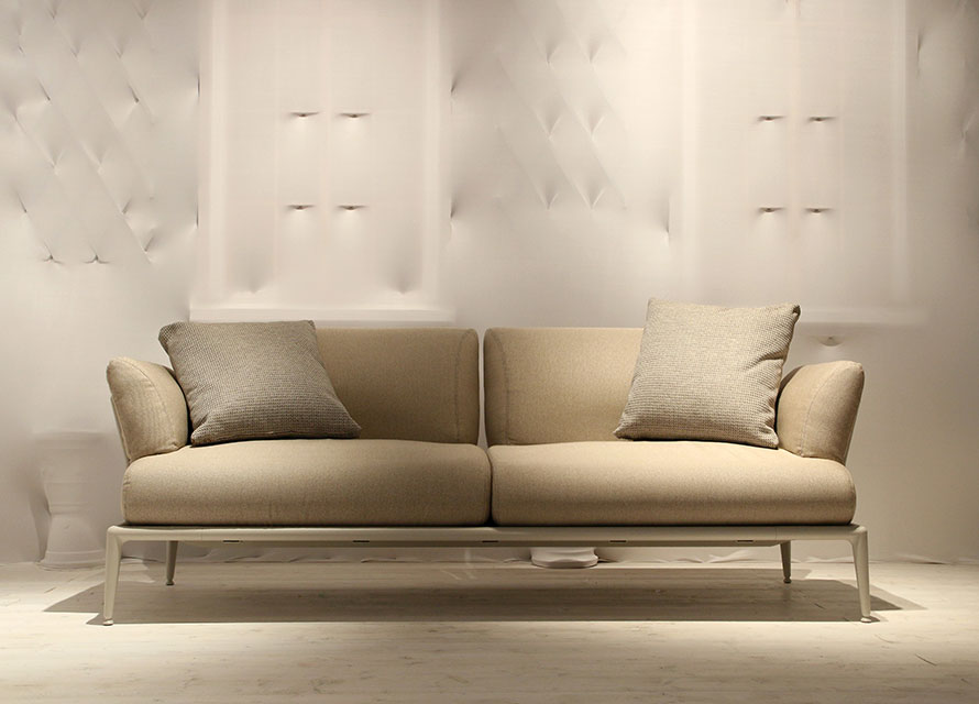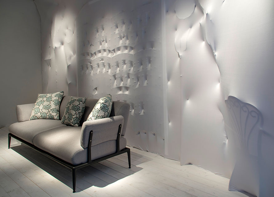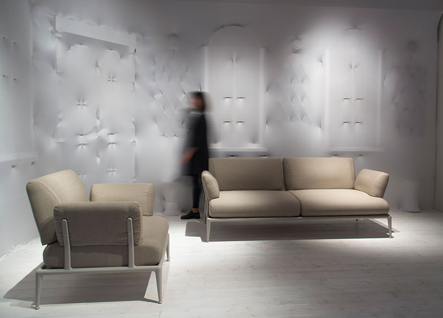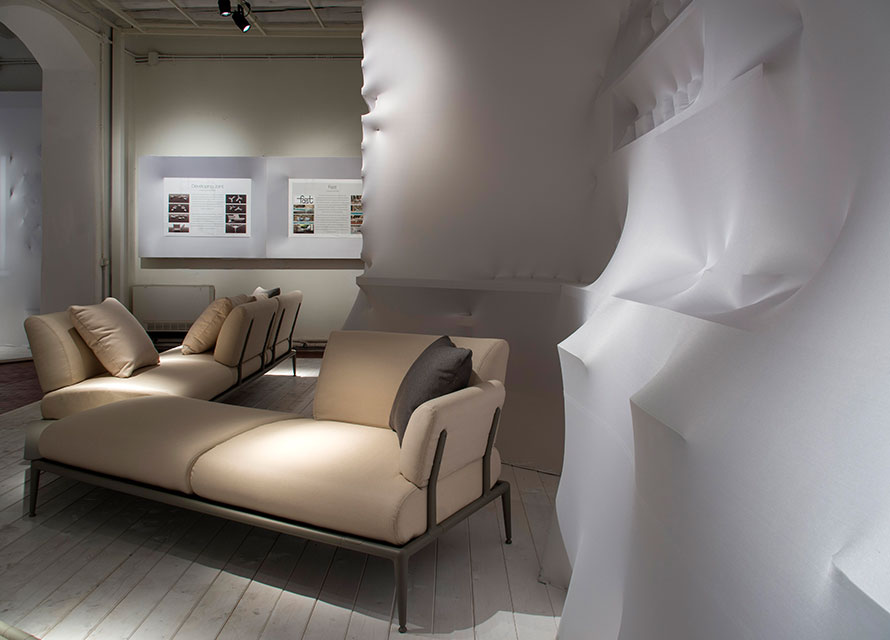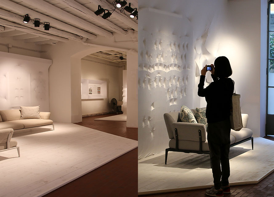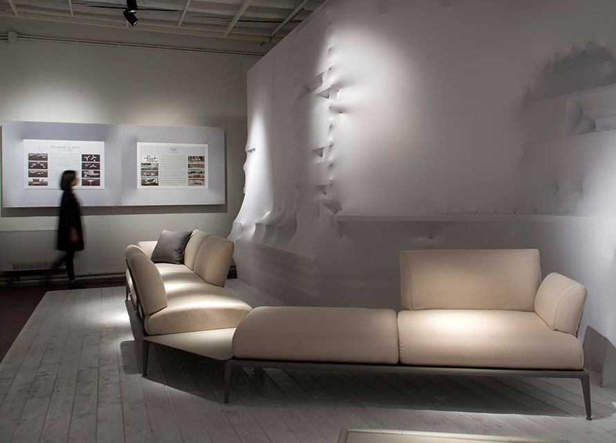 Allestimento realizzato al Fuori Salone in zona Tortona, nello spazio Back12, in occasione della presentazione del nuovo divano modulare Joint.