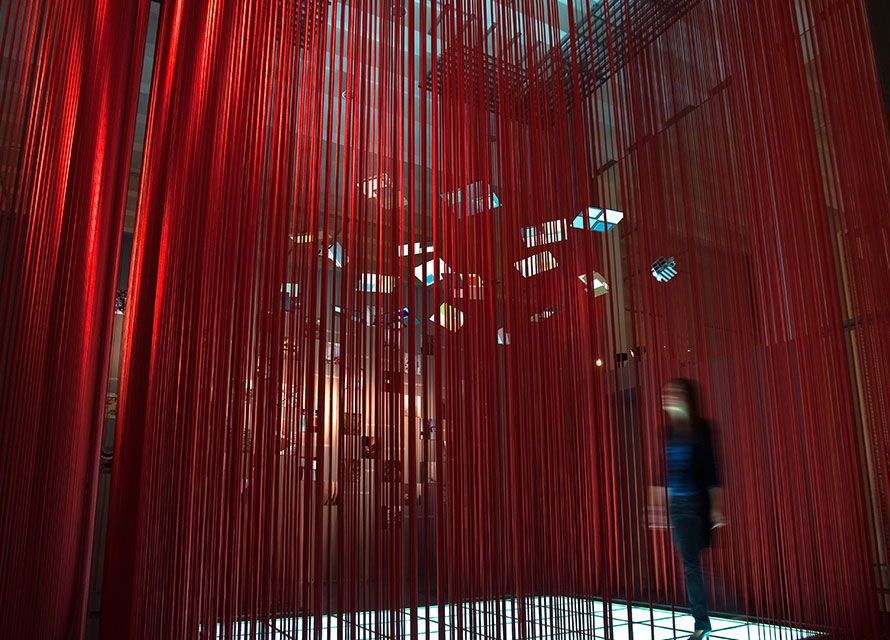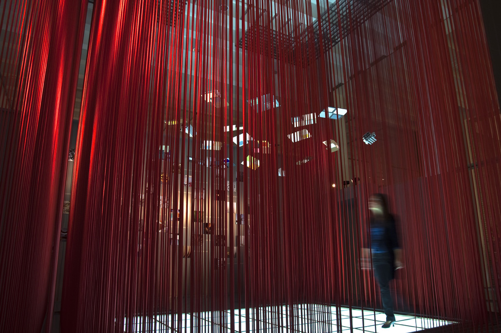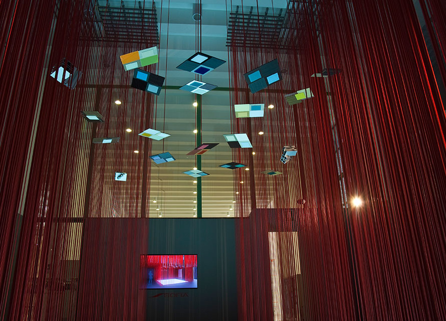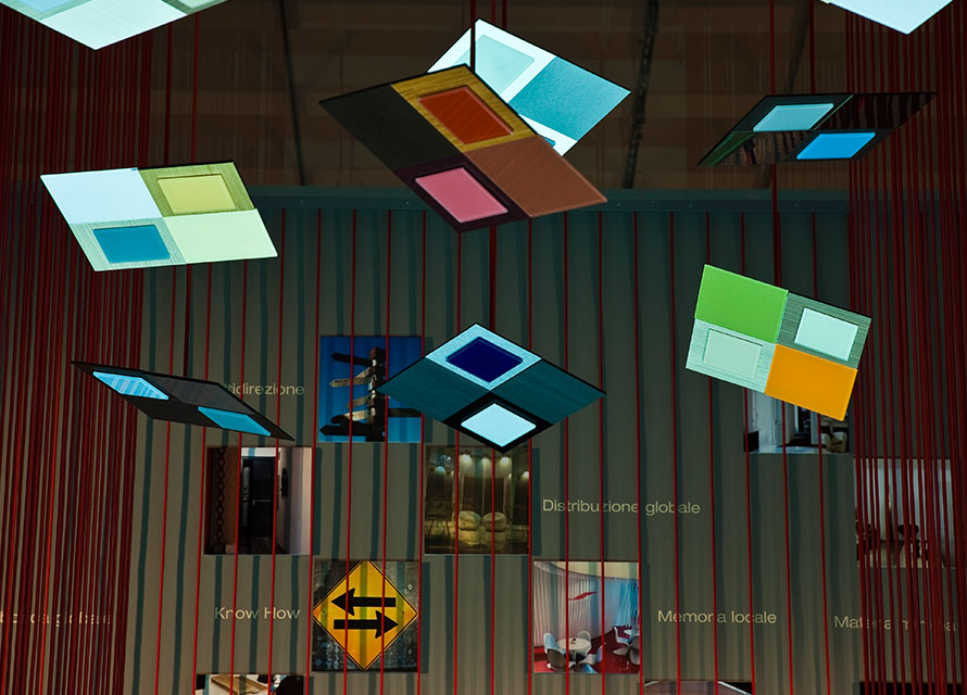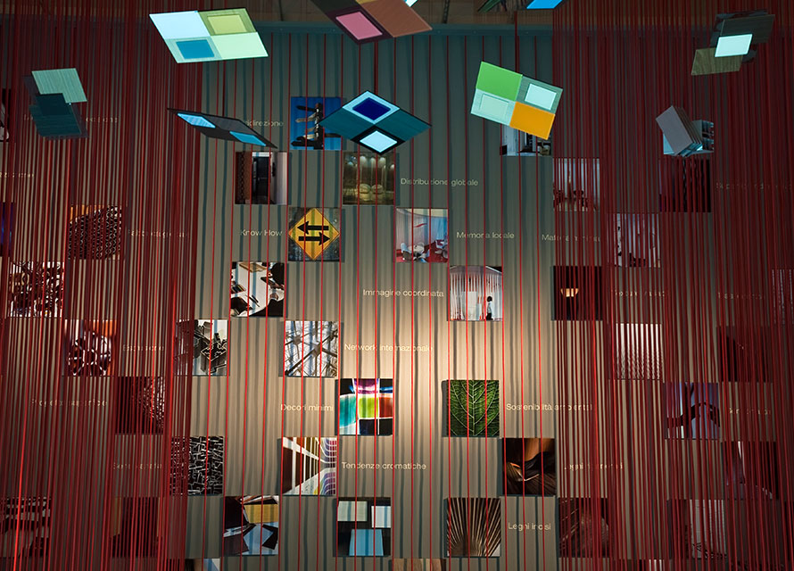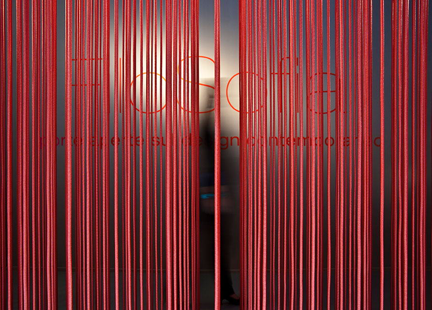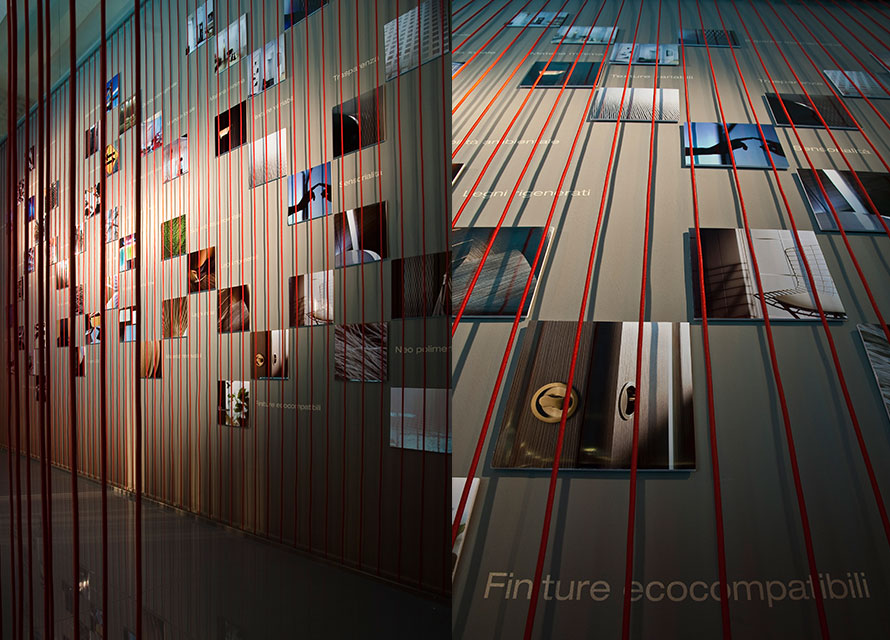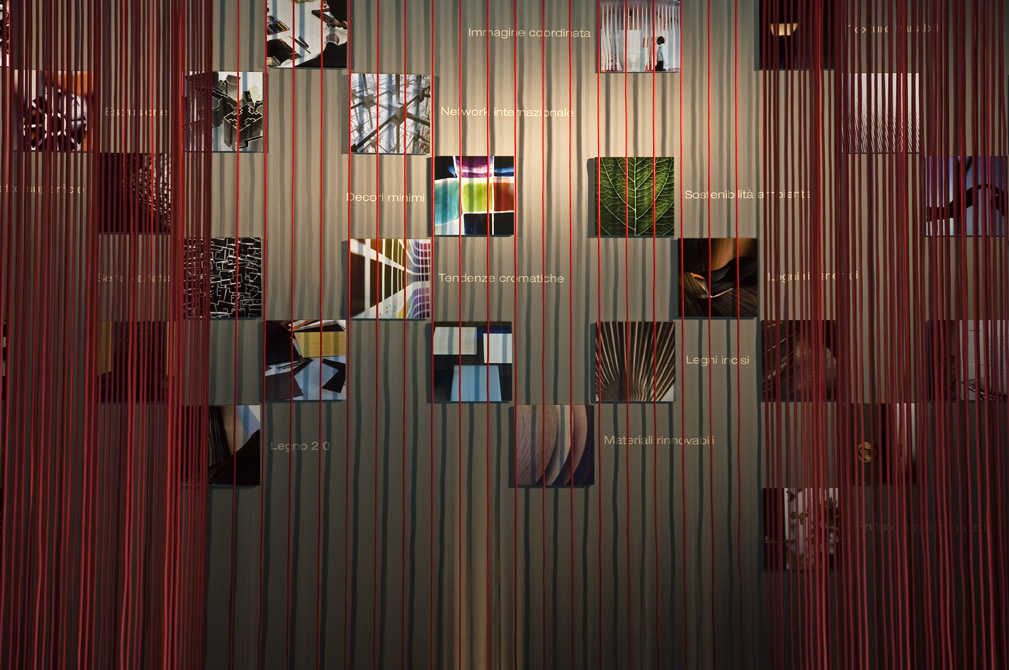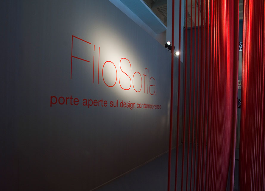 Allestimento nello spazio espositivo di Material ConneXion, dove, riprendendo il tema del filo, già usato in altri stand per la stessa Sofia, si cerca di esporre i nuovi materiali dell’azienda Sofia e la filosofia della stessa.