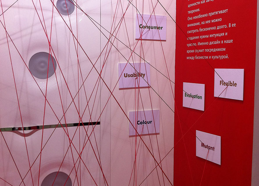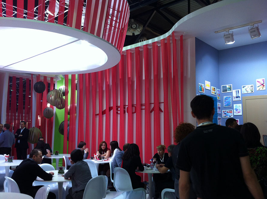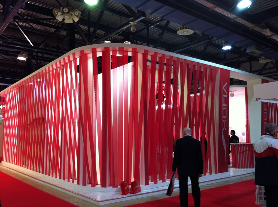 Con lo stesso principio dei cavi e delle sagome in PS, sono state utilizzate delle fettucce di tessuto rosso per scandire il perimetro dello stand. All’interno sono state dedicate quattro aree in cui esporre la filosofia e i principi dell’azienda.