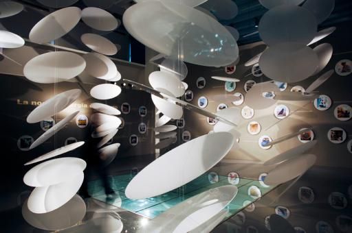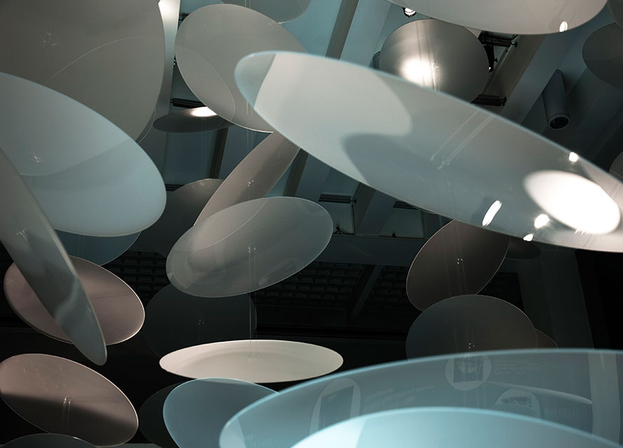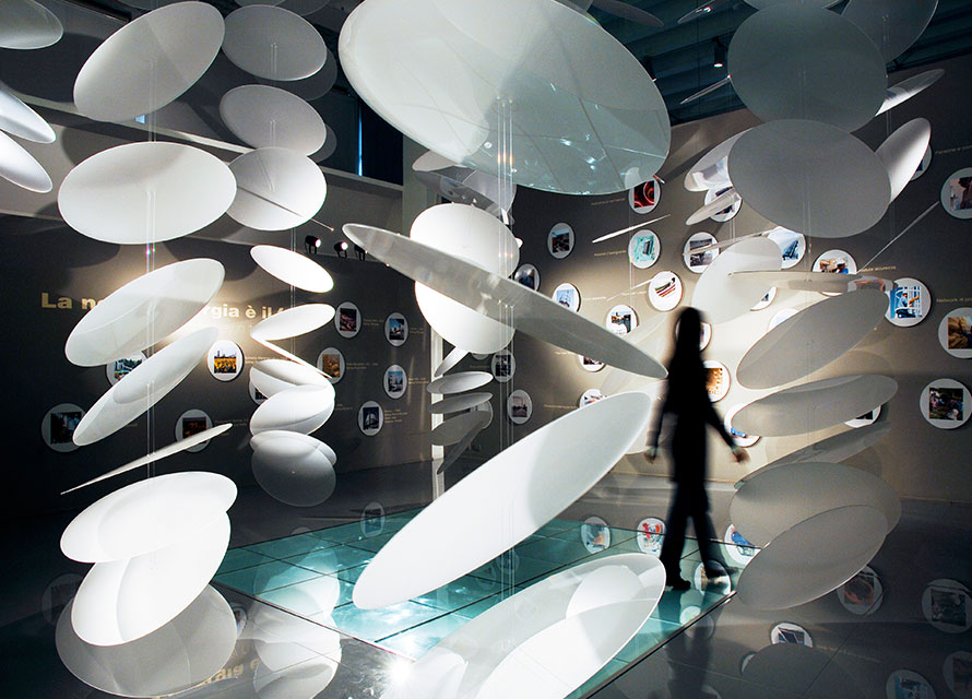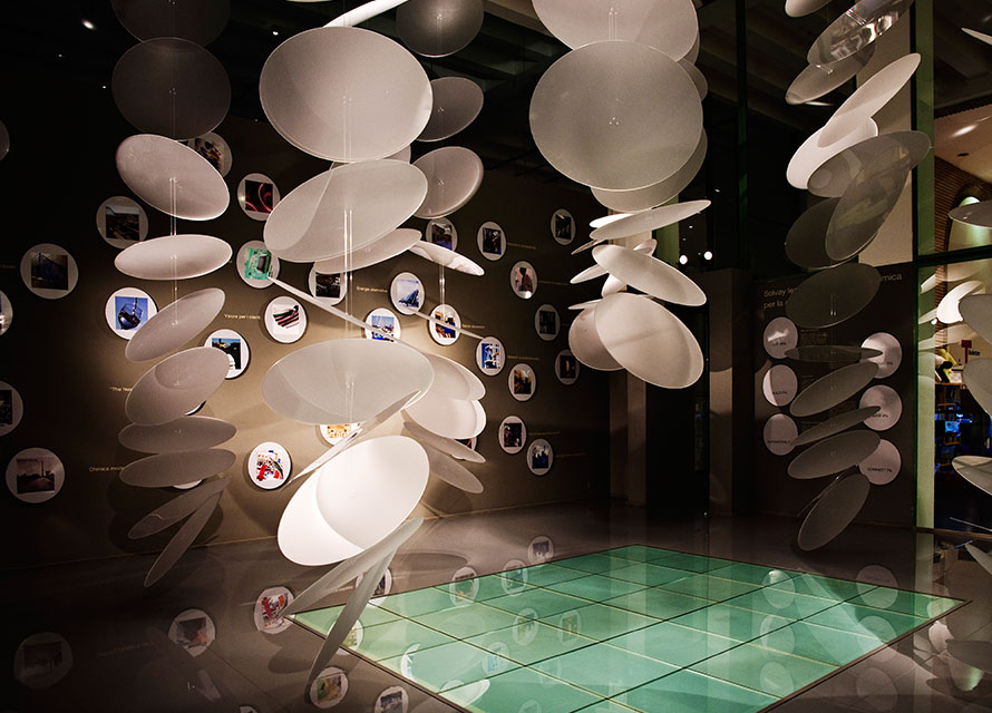 Bolle, bolle, bolle. L’allestimento realizzato alla Triennale di Milano, spazio espositivo di Material ConneXion, per i cento anni di Solvay, vuole far vivere all’utente l’emozione di essere in un bicchiere di acqua effervescente.