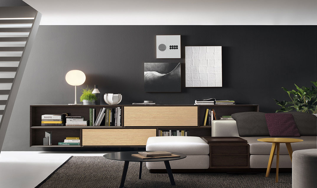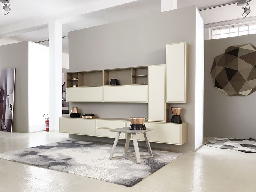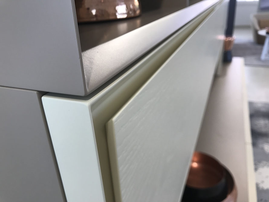 Collezione mobili per l’area living, caratterizzati dal profilo interno dell’anta inclinato e da un ulteriore pannello centrale, anch’esso con i bordi inclinati, che favoriscono la presa per l’apertura di ante e cassetti.