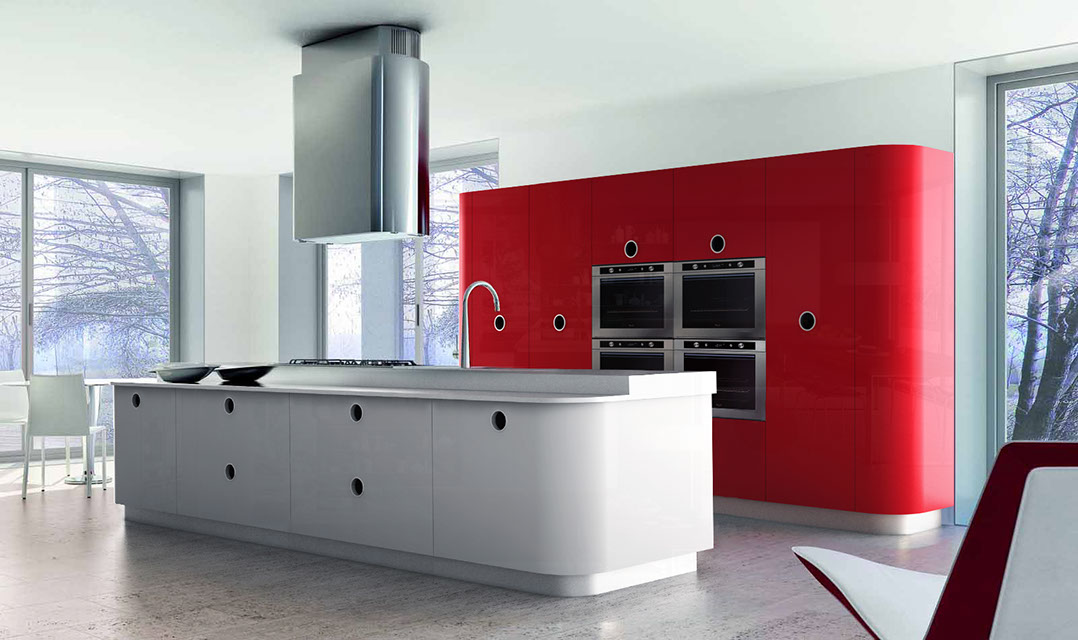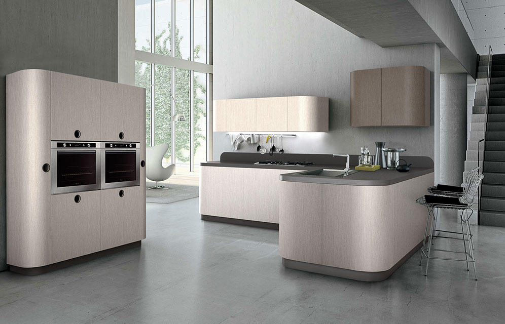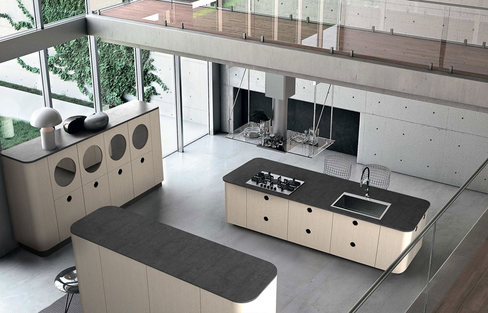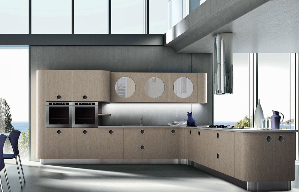 Restyling del modello di cucina prodotta da Driada. Cucina caratterizzata da pensili con vetrature a oblo e maniglie di ante e cassetti anch’esse circolari.