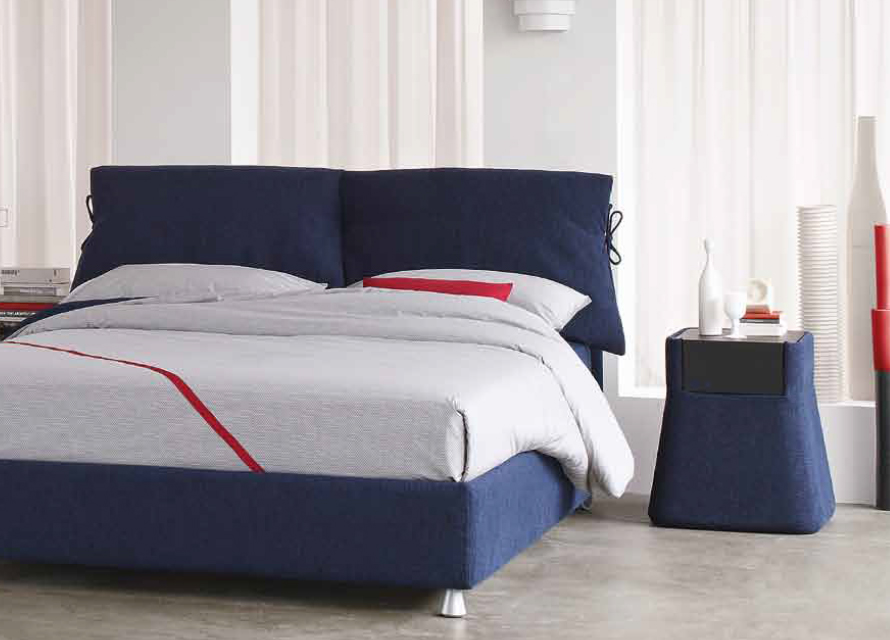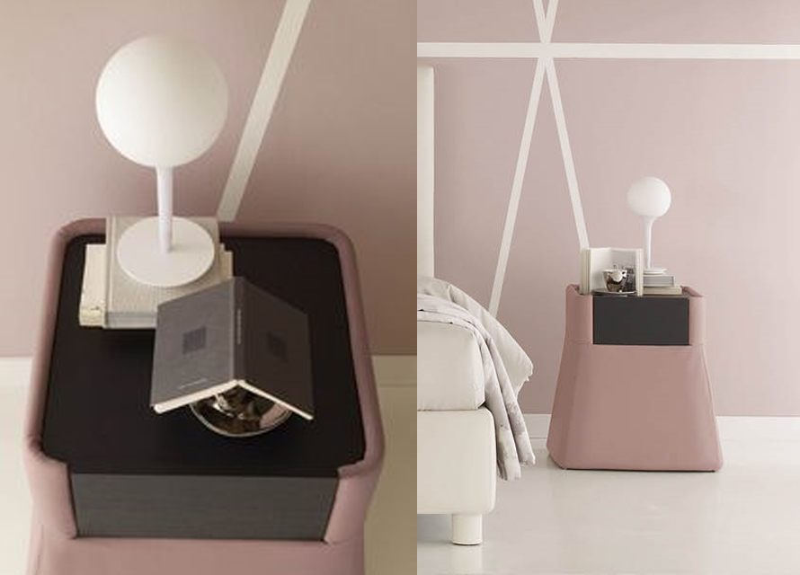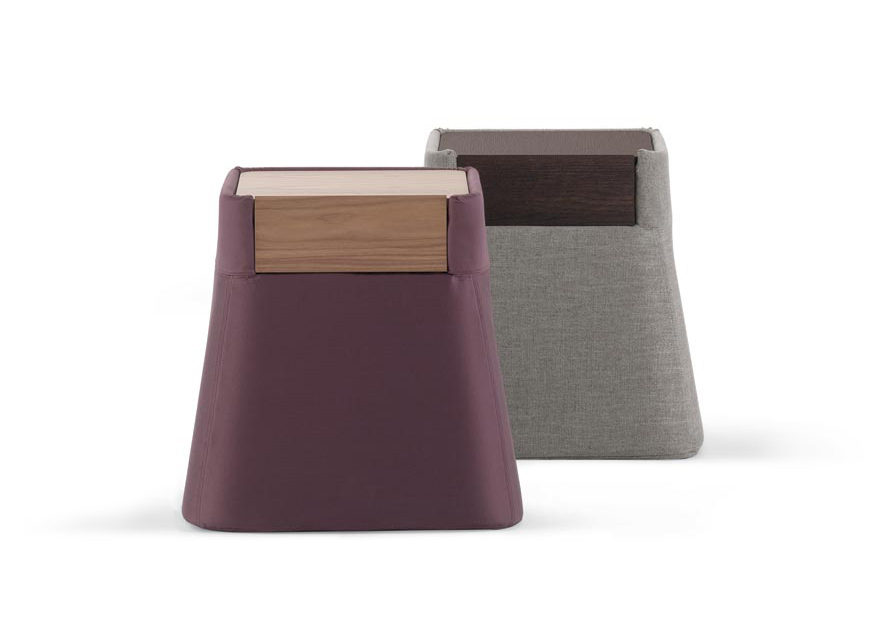 Comodino a forma di tronco di piramide realizzato con il corpo inferiore in schiumato poliuretanico, incollato al cassetto in legno e rivestito il tutto in tessuto.