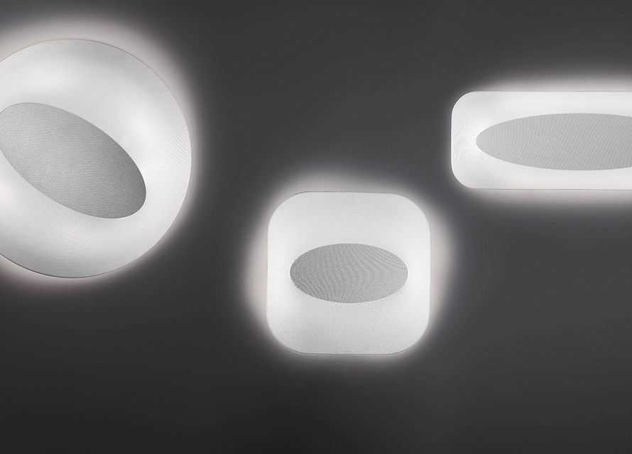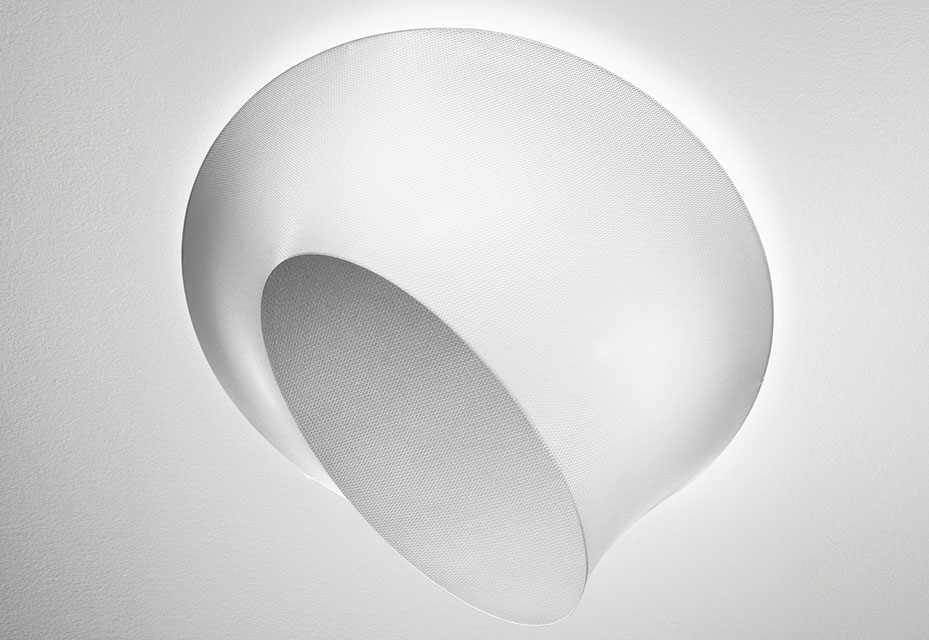 Lampada con telaio metallico e paralume in tessuto elastico. Realizzata con forme semplici alla base che per esaltare la malleabilità del tessuto si trasformano in ellissi.