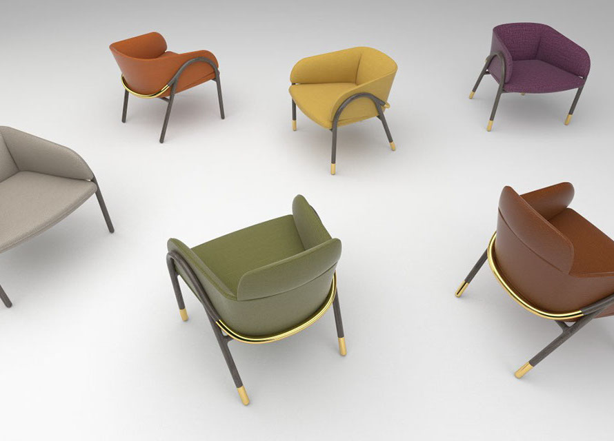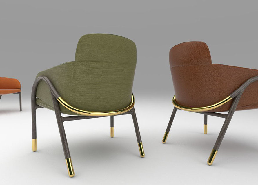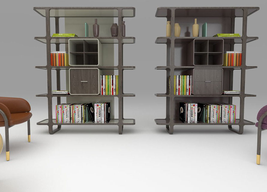 Collezione living. Strutture in legno curvato dalla sezione circolare o quadrata. Famiglia che comprende easychair, librerie, e tavoli.