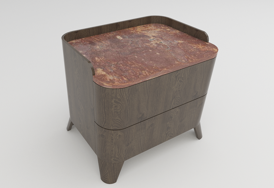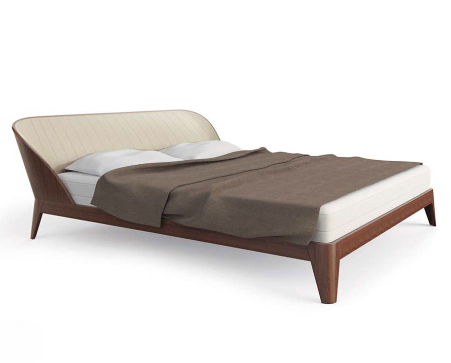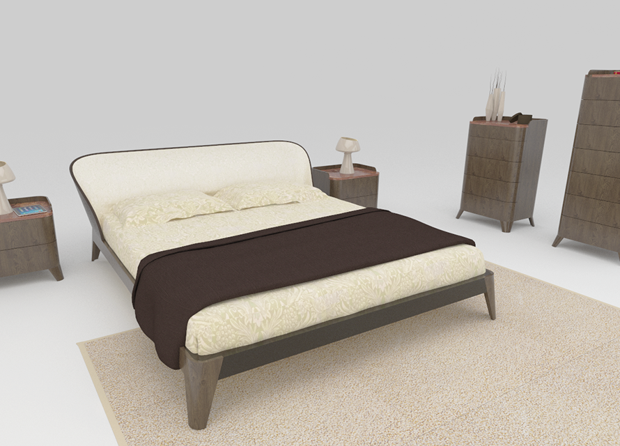 Sistema notte caratterizzato dalle gambe curvate ad angolo e il colletto che nasce imbottito sul letto e poi diventa un pannello curvato nei mobili, comodini, cassettiere e madia.